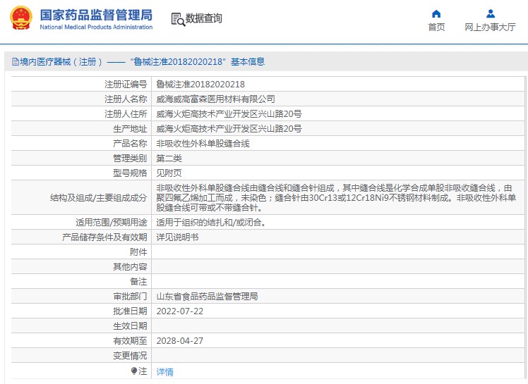 非吸收性外科單股縫合線由縫合線和縫合針組成,其中縫合線是化學(xué)合成單股非吸收縫合線,由聚偏氟乙烯加工而成,染色;縫合針由30Cr13或12Cr18Ni9不銹鋼材料制成。非吸收性外科單股縫合線可帶或不帶縫合針。