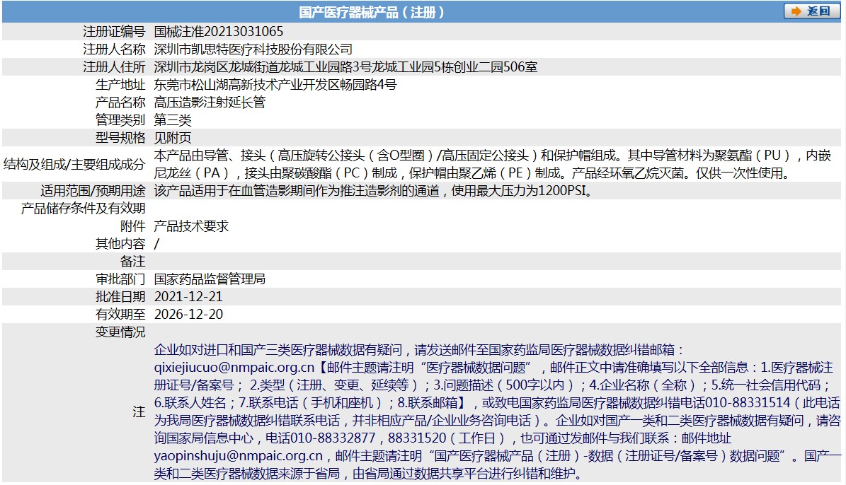 產(chǎn)品由導(dǎo)管、接頭(高壓旋轉(zhuǎn)公接頭(含O型圈)/高壓固定公接頭)和保護(hù)帽組成。其中導(dǎo)管材料為聚氨酯(PU),內(nèi)嵌尼龍絲(PA),接頭由聚碳酸酯(PC)制成,保護(hù)帽由聚乙烯(PE)制成。產(chǎn)品經(jīng)環(huán)氧乙烷滅菌。僅供***次性使用。產(chǎn)品適用于在血管造影期間作為推注造影劑的通道,使用***大壓力為1200PSI。