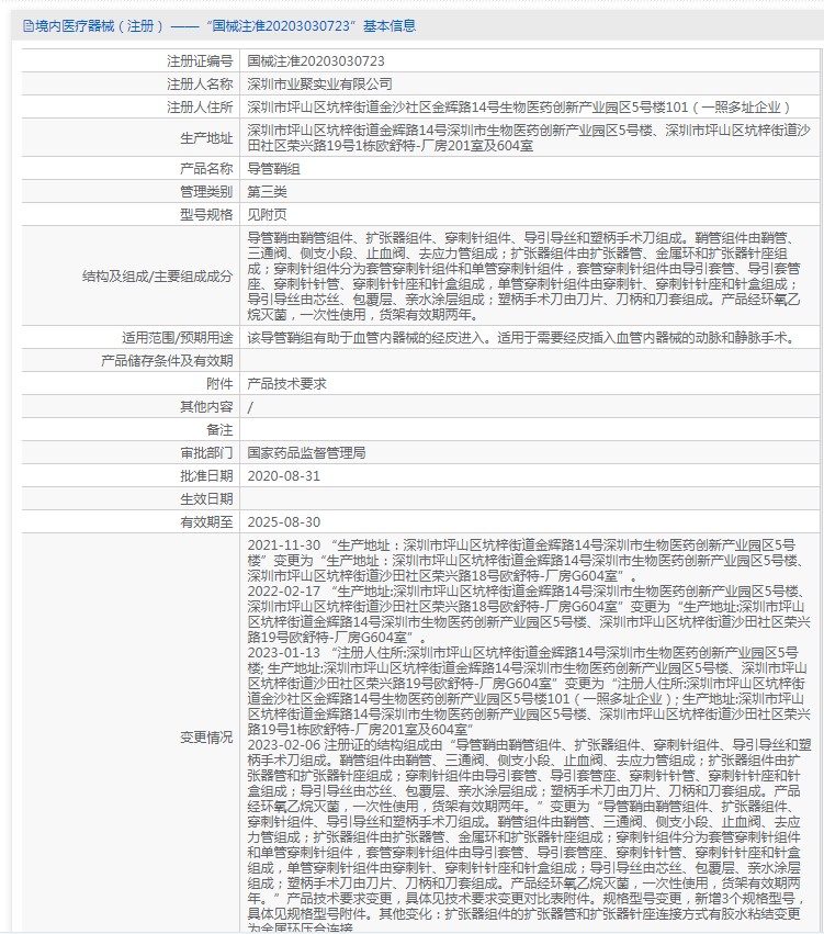 導(dǎo)管鞘由鞘管組件、擴張器組件、穿刺針組件、導(dǎo)引導(dǎo)絲和塑柄手術(shù)刀組成。鞘管組件由鞘管、三通閥、側(cè)支小段、止血閥、去應(yīng)力管組成;擴張器組件由擴張器管、金屬環(huán)和擴張器針座組成;穿刺針組件分為套管穿刺針組件和單管穿刺針組件,套管穿刺針組件由導(dǎo)引套管、導(dǎo)引套管座、穿刺針針管、穿刺針針座和針盒組成,單管穿刺針組件由穿刺針、穿刺針針座和針盒組成;導(dǎo)引導(dǎo)絲由芯絲、包覆層、親水涂層組成;塑柄手術(shù)刀由刀片、刀柄和刀套組成。產(chǎn)品經(jīng)環(huán)氧乙烷滅菌,***次性使用,貨架有效期兩年。