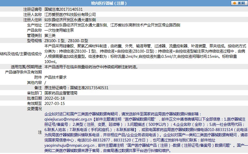 本產(chǎn)品采用硅橡膠、聚氯乙烯材料制造,由藥囊、外殼、輸液導(dǎo)管、過濾器、流量控制器、補(bǔ)液裝置、泵夾組成。按給藥方式分類為:持續(xù)給液(ZB100-Ⅰ型)、持續(xù)給液+自控給液(ZB100-Ⅱ型);持續(xù)給液+自控給液型輸注泵為持續(xù)給液過程中,由病人根據(jù)需要追加給液量型。給液參數(shù)為:標(biāo)稱流量:2ml/hr,自控給液劑量:0.5ml/次,自控給液間隔時間:15min。 產(chǎn)品咨詢請聯(lián)系上海聚慕醫(yī)療器械有限公司,聯(lián)系 方式:1-8-9-0-1-9-1-2-7-5-5 (羅),郵箱 :postmaster@jmmedical.cn