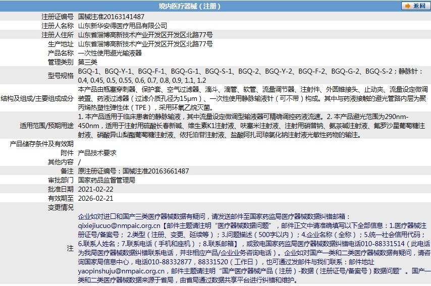 本產(chǎn)品由瓶塞穿刺器、保護(hù)套、空氣過濾器、滴斗、滴管、軟管、流量調(diào)節(jié)器、注射件、外圓錐接頭、止動夾、流量設(shè)定微調(diào)裝置、藥液過濾器(過濾介質(zhì)孔徑為15μm)、***次性使用靜脈輸液針(可不帶)構(gòu)成。其中與藥液接觸的避光管路內(nèi)層為聚丙烯熱塑性彈性體(TPE),采用環(huán)氧乙烷滅菌。