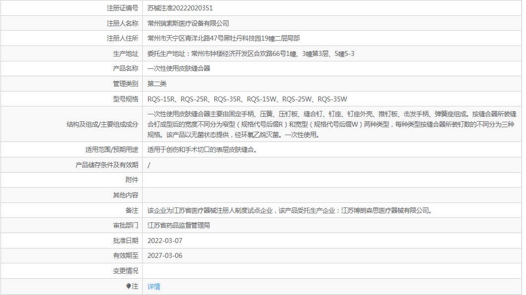 ***次性使用皮膚縫合器主要由固定手柄、壓簧、壓釘板、縫合釘、釘座、釘座外殼、推釘板、擊發(fā)手柄、彈簧座組成。按縫合器所裝縫合釘成型后的寬度不同分為窄型(規(guī)格代號(hào)后綴R)和寬型(規(guī)格代號(hào)后綴W)兩種類型,每種類型按縫合器所裝釘數(shù)的不同分為三種規(guī)格。該產(chǎn)品以無菌狀態(tài)提供,經(jīng)環(huán)氧乙烷滅菌。