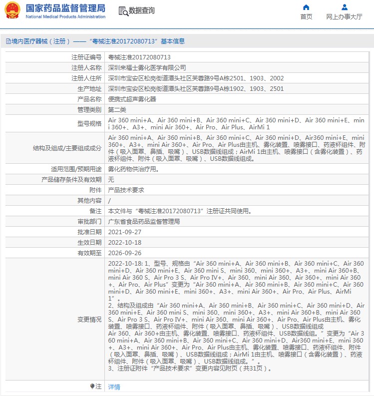 Air 360 mini+A、Air 360 mini+B、Air 360 mini+C、Air 360 mini+D、Air360 mini+E、mini 360+、A3+、mini Air 360+、Air Pro、Air Plus由主機、霧化裝置、噴霧接口、藥液杯組件、附件(吸入面罩、鼻插、吸嘴)、USB數(shù)據(jù)線組成;AirMi 1由主機、噴霧接口(含霧化裝置)、藥液杯組件、附件(吸入面罩、吸嘴)、USB數(shù)據(jù)線組成。