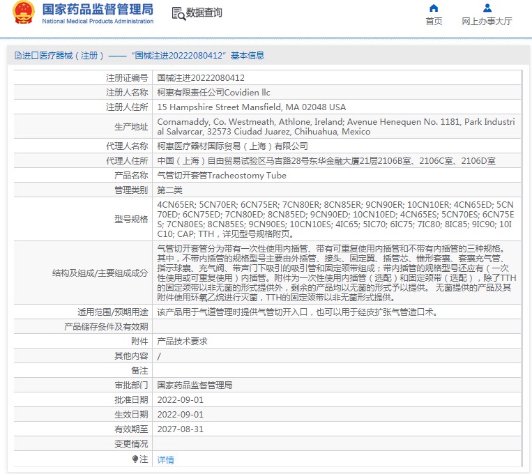 氣管切開套管分為帶有***次性使用內(nèi)插管、帶有可重復(fù)使用內(nèi)插管和不帶有內(nèi)插管的三種規(guī)格。其中,不帶內(nèi)插管的規(guī)格型號(hào)主要由外插管、接頭、固定翼、插管芯、錐形套囊、套囊充氣管、指示球囊、充氣閥、帶聲門下吸引的吸引管和固定頸帶組成;帶內(nèi)插管的規(guī)格型號(hào)還應(yīng)有(***次性使用或可重復(fù)使用)內(nèi)插管。附件為***次性使用內(nèi)插管(選配)和固定頸帶(選配),除了TTH的固定頸帶以非無菌的形式提供外,剩余的產(chǎn)品均以無菌的形式予以提供。 無菌提供的產(chǎn)品及其附件使用環(huán)氧乙烷進(jìn)行滅菌,TTH的固定頸帶以非無菌形式提供。