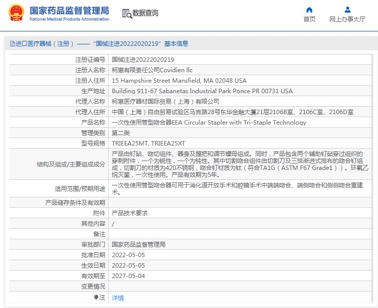 產(chǎn)品由釘砧、吻切組件、器身及握把和調(diào)節(jié)螺母組成。同時,產(chǎn)品包含兩個輔助釘砧穿過組織的穿刺附件,***個為銳性,***個為鈍性。其中切割吻合組件由切割刀及三排漸進(jìn)式排布的吻合釘組成,切割刀的材質(zhì)為420不銹鋼,吻合釘材質(zhì)為鈦(符合TA1G(ASTM F67 Grade1))。環(huán)氧乙烷滅菌,***次性使用。產(chǎn)品有效期為5年。