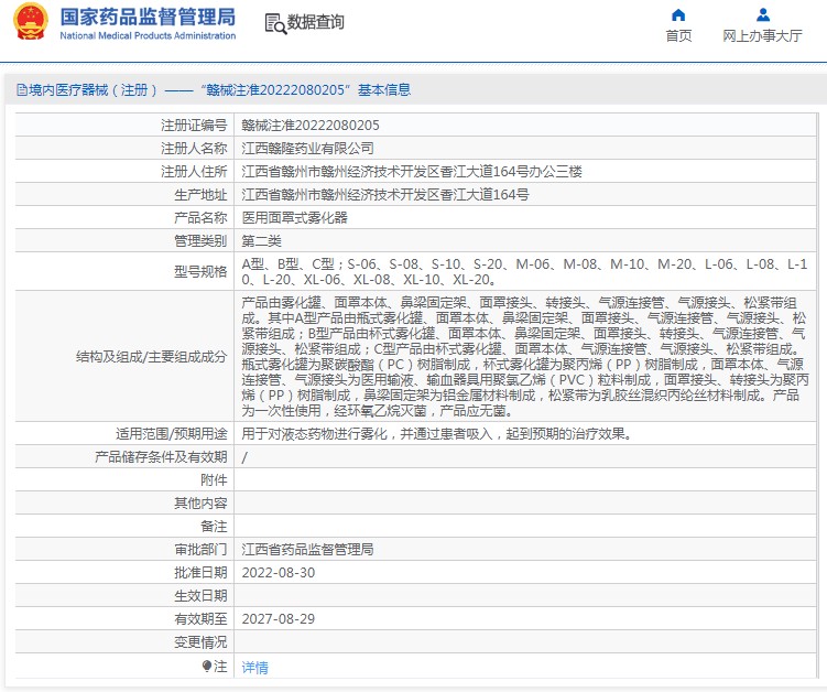 產(chǎn)品由霧化罐、面罩本體、鼻梁固定架、面罩接頭、轉(zhuǎn)接頭、氣源連接管、氣源接頭、松緊帶組成。其中A型產(chǎn)品由瓶式霧化罐、面罩本體、鼻梁固定架、面罩接頭、氣源連接管、氣源接頭、松緊帶組成;B型產(chǎn)品由杯式霧化罐、面罩本體、鼻梁固定架、面罩接頭、轉(zhuǎn)接頭、氣源連接管、氣源接頭、松緊帶組成;C型產(chǎn)品由杯式霧化罐、面罩本體、氣源連接管、氣源接頭、松緊帶組成。瓶式霧化罐為聚碳酸酯(PC)樹(shù)脂制成,杯式霧化罐為聚丙烯(PP)樹(shù)脂制成,面罩本體、氣源連接管、氣源接頭為醫(yī)用輸液、輸血器具用聚氯乙烯(PVC)粒料制成,面罩接頭、轉(zhuǎn)接頭為聚丙烯(PP)樹(shù)脂制成,鼻梁固定架為鋁金屬材料制成,松緊帶為乳膠絲混織丙綸絲材料制成。產(chǎn)品為***次性使用,經(jīng)環(huán)氧乙烷滅菌,產(chǎn)品應(yīng)無(wú)菌。