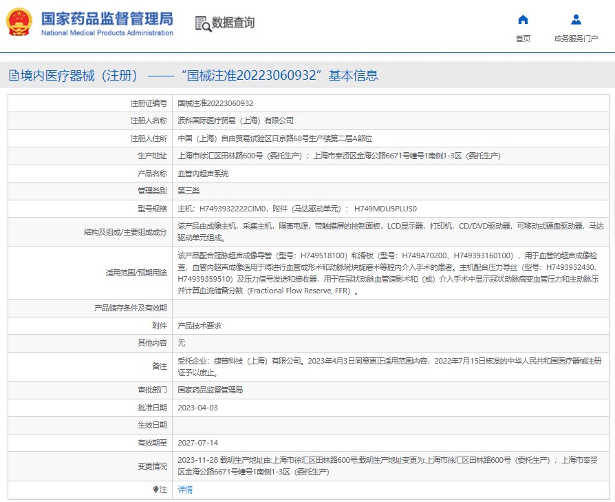 該產(chǎn)品配合冠脈超聲成像導(dǎo)管(型號:H749518100)和滑板(型號:H749A70200、H749393160100),用于血管的超聲成像檢查,血管內(nèi)超聲成像適用于將進行血管成形術(shù)和動脈斑塊旋磨術(shù)等腔內(nèi)介入手術(shù)的患者。主機配合壓力導(dǎo)絲(型號:H7493932430、H74939359510)及壓力信號發(fā)送和接收器,用于在冠狀動脈血管造影術(shù)和(或)介入手術(shù)中顯示冠狀動脈病變血管壓力和主動脈壓并計算血流儲備分數(shù)(Fractional Flow Reserve, FFR)。