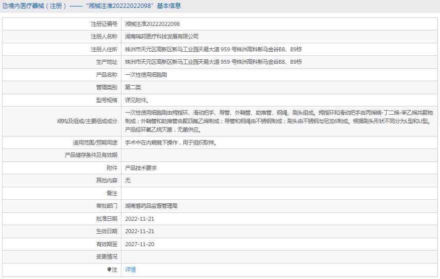 ***次性使用細(xì)胞刷由拇指環(huán)、滑動(dòng)把手、導(dǎo)管、外鞘管、助推管、鋼繩、刷頭組成。拇指環(huán)和滑動(dòng)把手由丙烯晴-丁二烯-苯乙烯共聚物制成;外鞘管和助推管由聚四氟乙烯制成;導(dǎo)管和鋼繩由不銹鋼制成;刷頭由不銹鋼與尼龍6制成。根據(jù)刷頭形狀不同分為L型和U型。