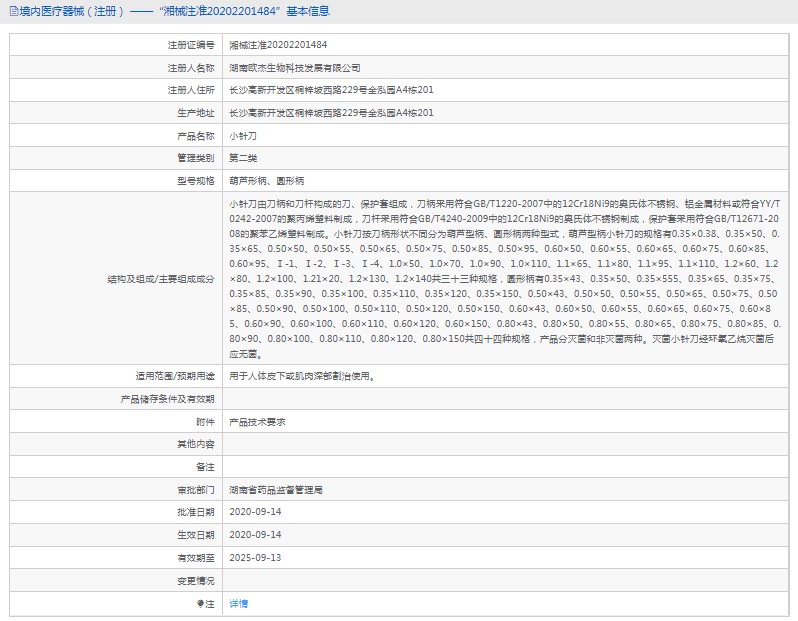 小針刀由刀柄和刀桿構(gòu)成的刀、保護(hù)套組成,刀柄采用符合GB/T1220-2007中的12Cr18Ni9的奧氏體不銹鋼、鋁金屬材料或符合YY/T0242-2007的聚丙烯塑料制成,刀桿采用符合GB/T4240-2009中的12Cr18Ni9的奧氏體不銹鋼制成,保護(hù)套采用符合GB/T12671-2008的聚苯乙烯塑料制成。小針刀按刀柄形狀不同分為葫蘆型柄、圓形柄兩種型式,葫蘆型柄小針刀的規(guī)格有0.35×0.38、0.35×50、0.35×65、0.50×50、0.50×55、0.50×65、0.50×75、0.50×85、0.50×95、0.60×50、0.60×55、0.60×65、0.60×75、0.60×85、0.60×95、Ⅰ-1、Ⅰ-2、Ⅰ-3、Ⅰ-4、1.0×50、1.0×70、1.0×90、1.0×110、1.1×65、1.1×80、1.1×95、1.1×110、1.2×60、1.2×80、1.2×100、1.21×20、1.2×130、1.2×140共三十三種規(guī)格,圓形柄有0.35×43、0.35×50、0.35×555、0.35×65、0.35×75、0.35×85、0.35×90、0.35×100、0.35×110、0.35×120、0.35×150、0.50×43、0.50×50、0.50×55、0.50×65、0.50×75、0.50×85、0.50×90、0.50×100、0.50×110、0.50×120、0.50×150、0.60×43、0.60×50、0.60×55、0.60×65、0.60×75、0.60×85、0.60×90、0.60×100、0.60×110、0.60×120、0.60×150、0.80×43、0.80×50、0.80×55、0.80×65、0.80×75、0.80×85、0.80×90、0.80×100、0.80×110、0.80×120、0.80×150共四十四種規(guī)格,產(chǎn)品分滅菌和非滅菌兩種。滅菌小針刀經(jīng)環(huán)氧乙烷滅菌后應(yīng)無(wú)菌。
