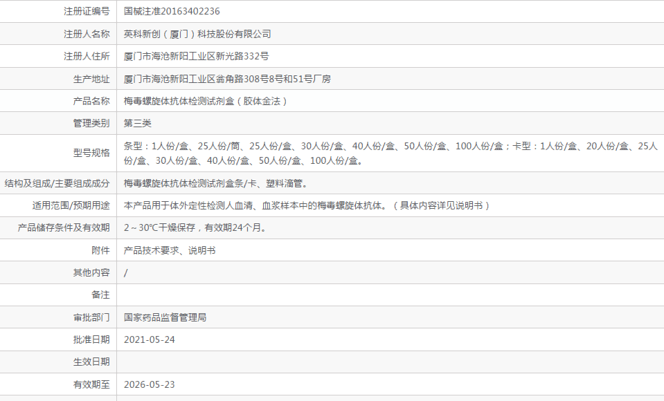溫馨提示:1.英科新創(chuàng)梅毒螺旋體抗體檢測試劑盒(膠體金法)1人份/盒可能含有禁忌內(nèi)容或者注意事項,具體詳見說明書;2.購買英科新創(chuàng)梅毒螺旋體抗體檢測試劑盒(膠體金法)1人份/盒后應(yīng)仔細(xì)閱讀英科新創(chuàng)梅毒螺旋體抗體檢測試劑盒(膠體金法)1人份/盒說明書或者在醫(yī)務(wù)人員的指導(dǎo)下購買和使用;3.以上英科新創(chuàng)梅毒螺旋體抗體檢測試劑盒(膠體金法)1人份/盒內(nèi)容均來自于生產(chǎn)廠***、代理商網(wǎng)站不作為宣傳購買依據(jù)如與英科新創(chuàng)梅毒螺旋體抗體檢測試劑盒(膠體金法)1人份/盒說明書有沖突的,均以英科新創(chuàng)梅毒螺旋體抗體檢測試劑盒(膠體金法)1人份/盒說明書為準(zhǔn);
