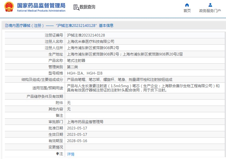 產(chǎn)品與人生長(zhǎng)激素注射液(1.5ml:5mg)筆芯和具有有效醫(yī)療器械注冊(cè)證的注射針頭配合使用,用于皮下注射。