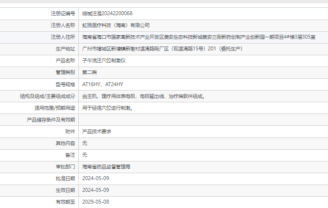注冊證編號(hào) 瓊械注準(zhǔn)20242200068 注冊人名稱 虹揚(yáng)醫(yī)療科技(海南)有限公司 注冊人住所 海南省海口市******高新技術(shù)產(chǎn)業(yè)開發(fā)區(qū)美安生態(tài)科技新城美安三街新藥創(chuàng)制產(chǎn)業(yè)創(chuàng)新園***期項(xiàng)目4#樓3層305室 生產(chǎn)地址 廣州市增城區(qū)新塘鎮(zhèn)新墩村溫涌路段廠區(qū)(現(xiàn)溫涌路15號(hào))201(委托生產(chǎn)) 產(chǎn)品名稱 子午流注穴位刺激儀 管理類別 第二類 型號(hào)規(guī)格 AT16HY、AT24HY 結(jié)構(gòu)及組成/主要組成成分 由主機(jī)、理療用體表電極、電極輸出線、治療端軟件組成。 適用范圍/預(yù)期用途 用于經(jīng)絡(luò)穴位進(jìn)行刺激。 產(chǎn)品儲(chǔ)存條件及有效期 附件 產(chǎn)品技術(shù)要求 其他內(nèi)容 無 備注 無 審批部門 海南省藥品監(jiān)督管理局 批準(zhǔn)日期 2024-05-09 生效日期 2024-05-09 有效期至 2029-05-08。