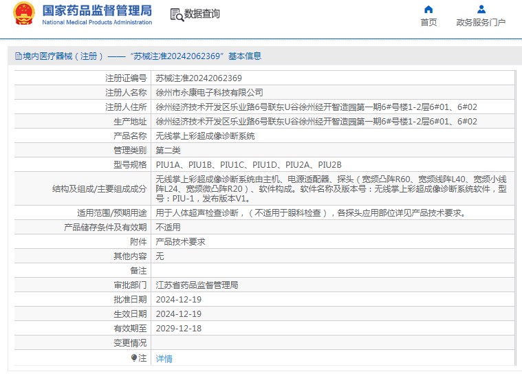 無線掌上彩超成像診斷系統(tǒng)由主機(jī)、電源適配器、探頭(寬頻凸陣R60、寬頻線陣L40、寬頻小線陣L24、寬頻微凸陣R20)、軟件構(gòu)成。軟件名稱及版本號(hào):無線掌上彩超成像診斷系統(tǒng)軟件,型號(hào):PIU-1,發(fā)布版本V1。