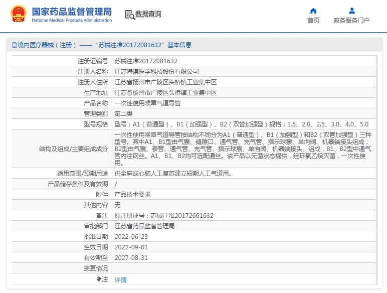***次性使用喉罩氣道導(dǎo)管按結(jié)構(gòu)不同分為A1(普通型)、B1(加強(qiáng)型)和B2(雙管加強(qiáng)型)三種型號(hào)。其中A1、B1型由氣囊、縫隙口、通氣管、充氣管、指示球囊、單向閥、機(jī)器端接頭組成,B2型由氣囊、套管、通氣管、充氣管、指示球囊、單向閥、機(jī)器端接頭、組成,B1、B2型中通氣管內(nèi)注鋼絲。A1、B1、B2均可選配通絲。該產(chǎn)品以無菌狀態(tài)提供,經(jīng)環(huán)氧乙烷滅菌,***次性使用。
