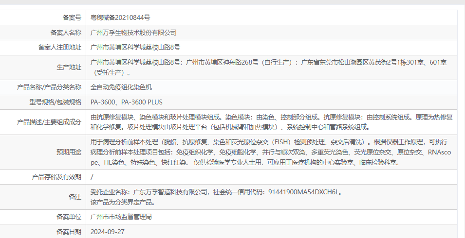 備案號(hào) 粵穗械備20210844號(hào) 備案人名稱 廣州萬孚生物技術(shù)股份有限公司 備案人注冊地址 廣州市黃埔區(qū)科學(xué)城荔枝山路8號(hào) 生產(chǎn)地址 廣州市黃埔區(qū)科學(xué)城荔枝山路8號(hào);廣州市黃埔區(qū)神舟路268號(hào)(自行生產(chǎn));廣東省東莞市松山湖園區(qū)黃芪街2號(hào)1棟301室、601室(受托生產(chǎn))。 產(chǎn)品名稱/產(chǎn)品分類名稱 全自動(dòng)免疫組化染色機(jī) 型號(hào)規(guī)格/包裝規(guī)格 PA-3600、PA-3600 PLUS 產(chǎn)品描述/主要組成成分 由抗原修復(fù)模塊、染色模塊和玻片處理模塊組成。染色模塊:由染色、控制部分組成。抗原修復(fù)模塊:由控制系統(tǒng)組成。原理為熱修復(fù)和化學(xué)修復(fù)。玻片處理模塊由玻片處理平臺(tái)(包括機(jī)械臂和加熱模塊)、系統(tǒng)控制中心和管路系統(tǒng)組成。 預(yù)期用途 用于病理分析前樣本處理(脫蠟、抗原修復(fù)、染色和熒光原位雜交(FISH)檢測預(yù)處理、雜交后清洗)。根據(jù)儀器工作原理,可執(zhí)行病理分析前樣本處理項(xiàng)目包括:免疫組織化學(xué)、免疫細(xì)胞化學(xué)、并行與順次雙染、多重?zé)晒馊旧晒庠浑s交、原位雜交、RNAscope、HE染色、特殊染色、快紅紅染。 僅供檢驗(yàn)醫(yī)學(xué)專業(yè)人士用,可應(yīng)用于醫(yī)療機(jī)構(gòu)的中心實(shí)驗(yàn)室、臨床檢驗(yàn)科室。 產(chǎn)品存儲(chǔ)及有效期 / 備注 受托企業(yè)名稱:廣東萬孚智造科技有限公司,社會(huì)統(tǒng)***信用代碼:91441900MA54DXCH6L。 該產(chǎn)品為分類界定產(chǎn)品。 備案單位 廣州市市場監(jiān)督管理局 備案日期 2024-09-27
