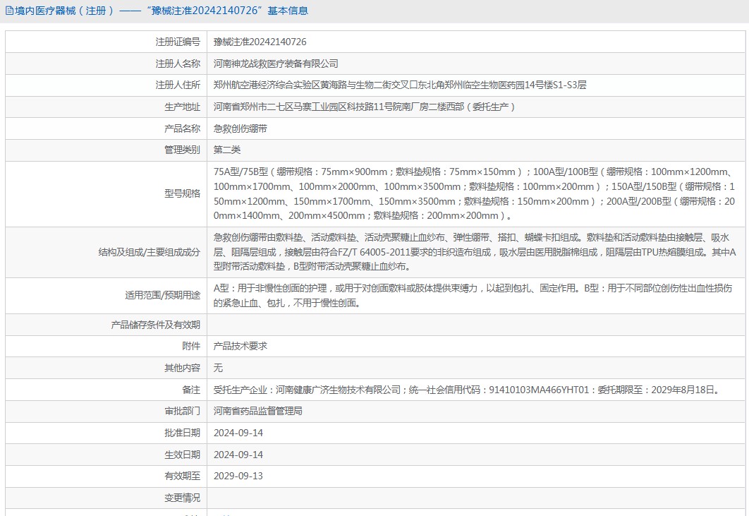 適用范圍/預(yù)期用途A型:用于非慢性創(chuàng)面的護(hù)理,或用于對創(chuàng)面敷料或肢體提供束縛力,以起到包扎、固定作用。B型:用于不同部位創(chuàng)傷性出血性損傷的緊急止血、包扎,不用于慢性創(chuàng)面。