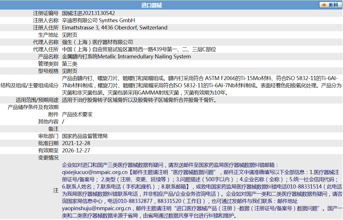 適用于治療股骨轉(zhuǎn)子區(qū)域骨折以及股骨轉(zhuǎn)子區(qū)域骨折合并股骨干骨折。產(chǎn)品由髓內(nèi)釘、螺旋刀片、髖螺釘和尾帽組成。髓內(nèi)釘采用符合 ASTM F2066的Ti-15Mo材料、符合ISO 5832-11的Ti-6Al-7Nb材料制成,螺旋刀片、髖螺釘和尾帽采用符合ISO 5832-11的Ti-6Al-7Nb材料制成。表面經(jīng)著色陽極氧化處理。產(chǎn)品分為滅菌和非滅菌包裝。滅菌包裝采用GAMMA射線滅菌,滅菌有效期為10年。